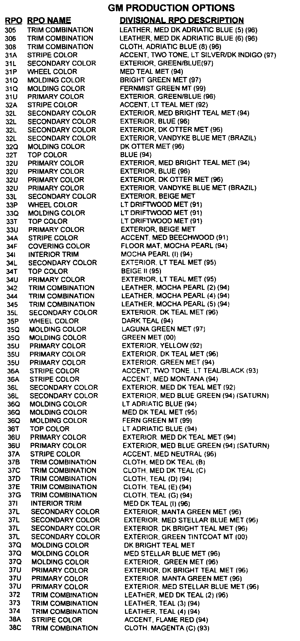 RPO Code List