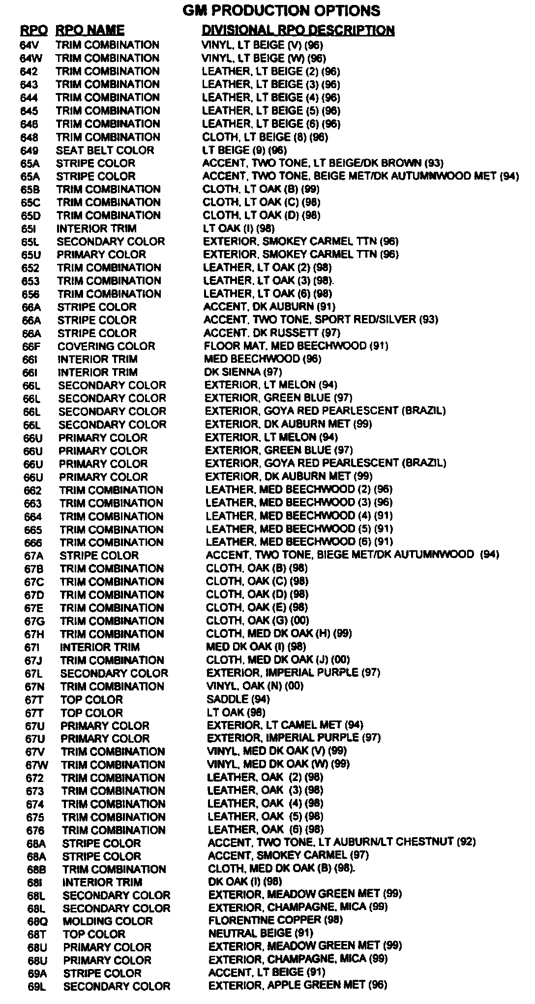 RPO Code List