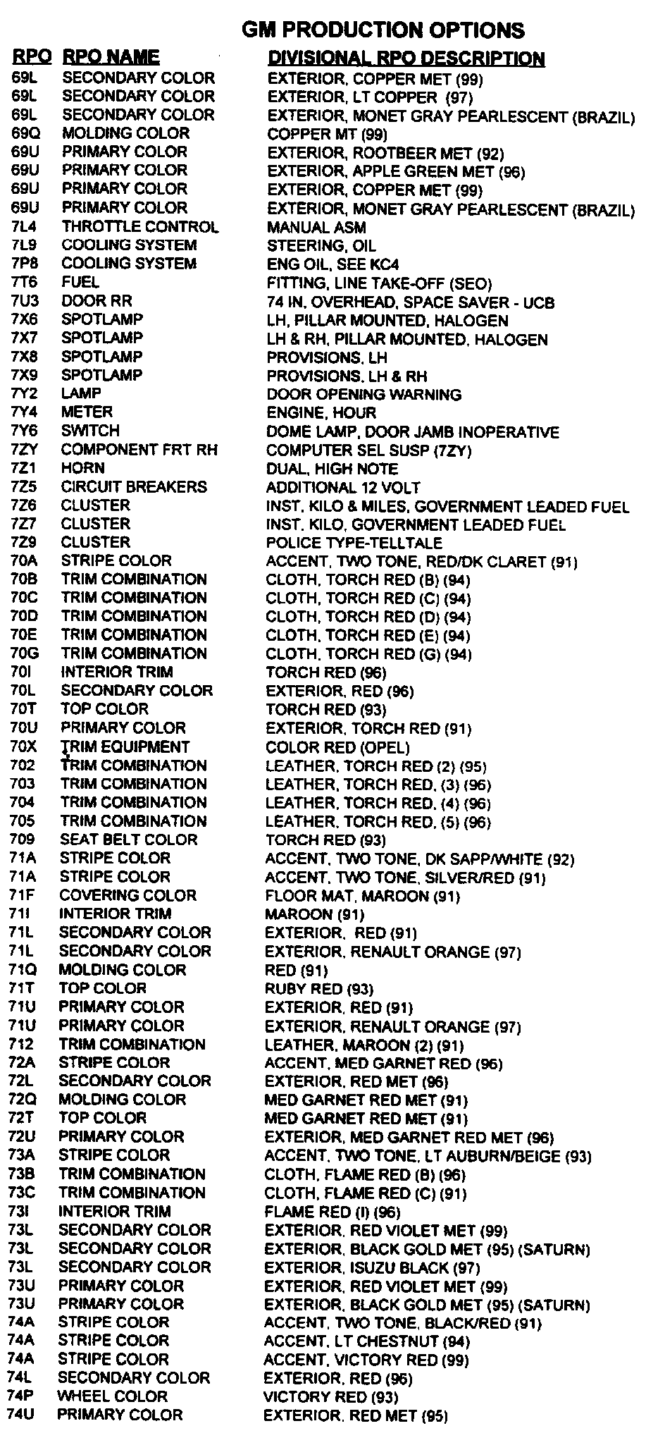 RPO Code List