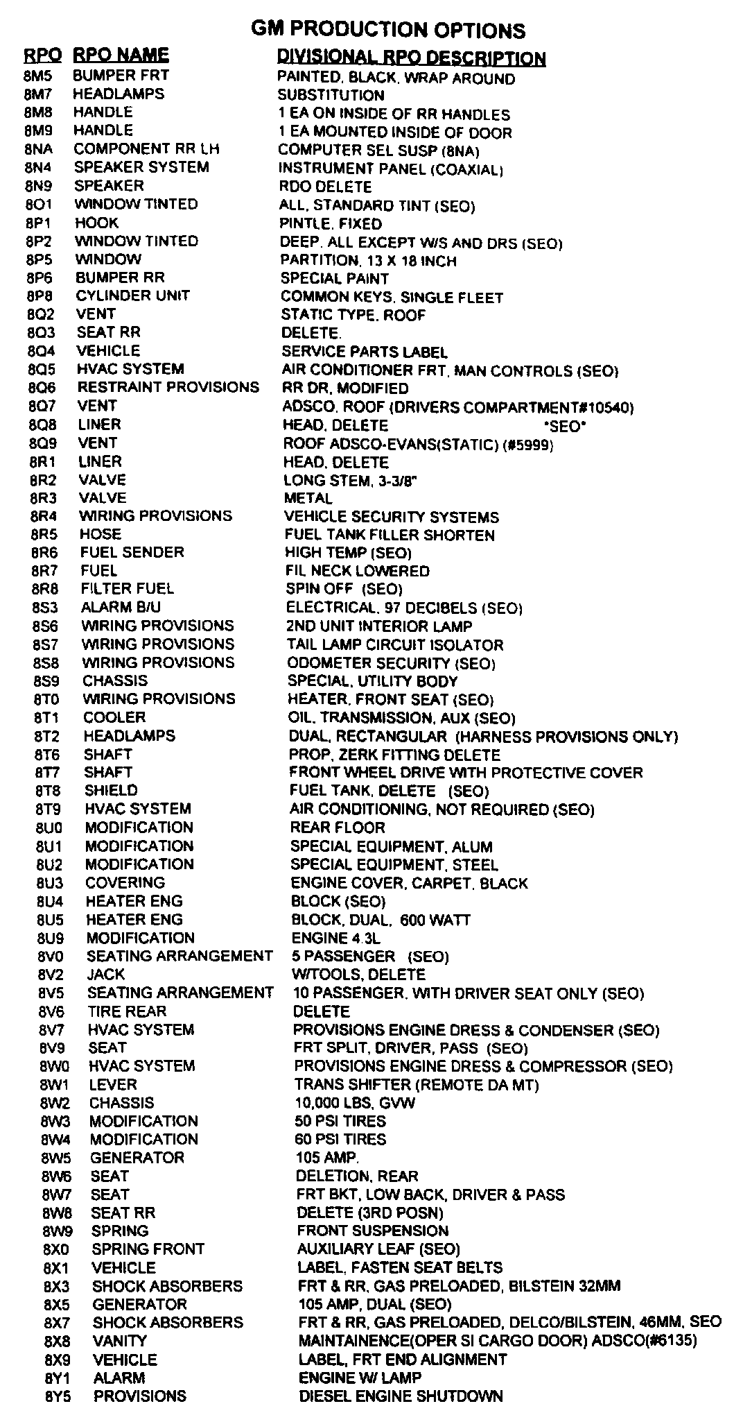 RPO Codes: 8M5-8Y5
