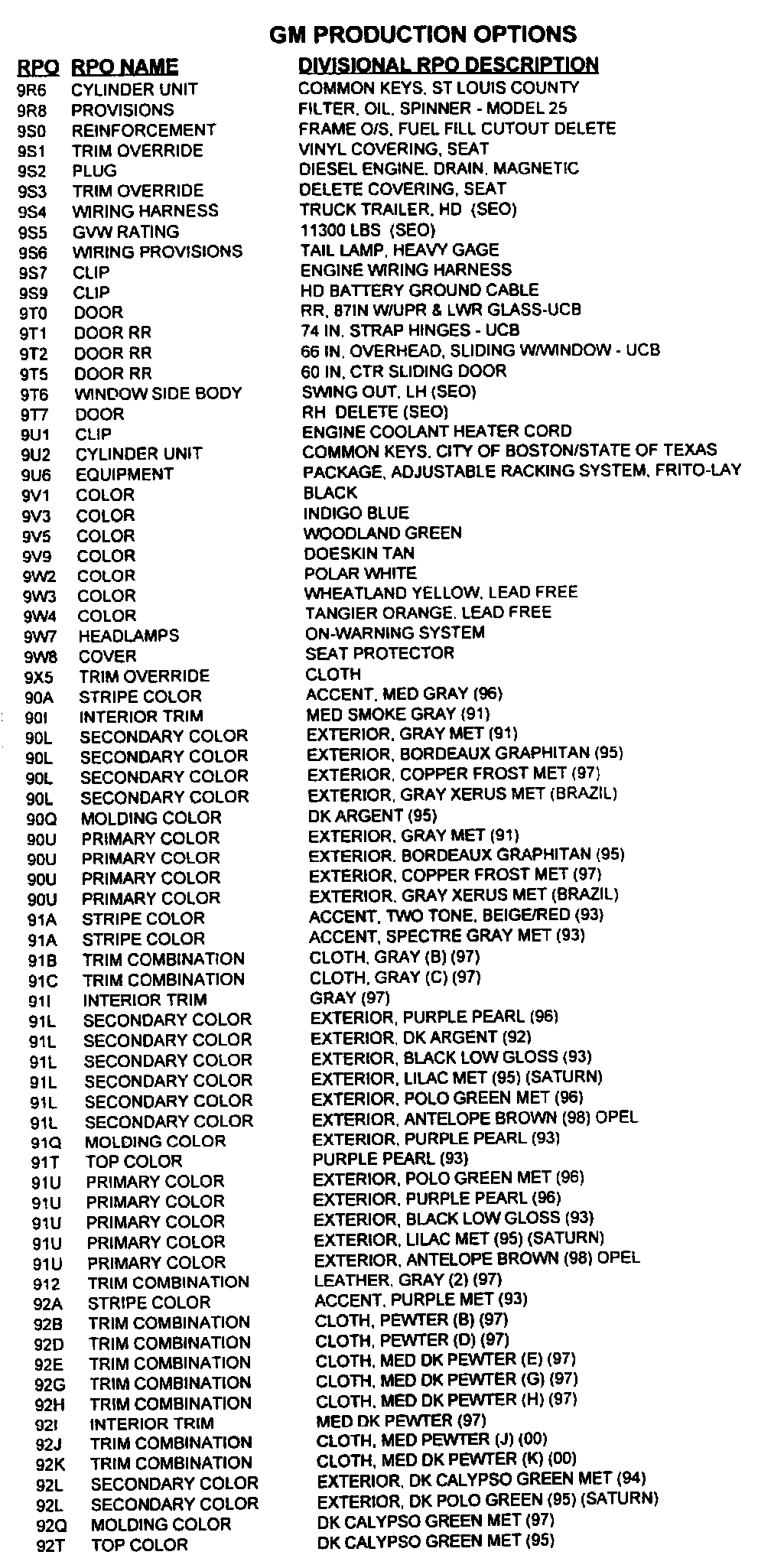 RPO Code List