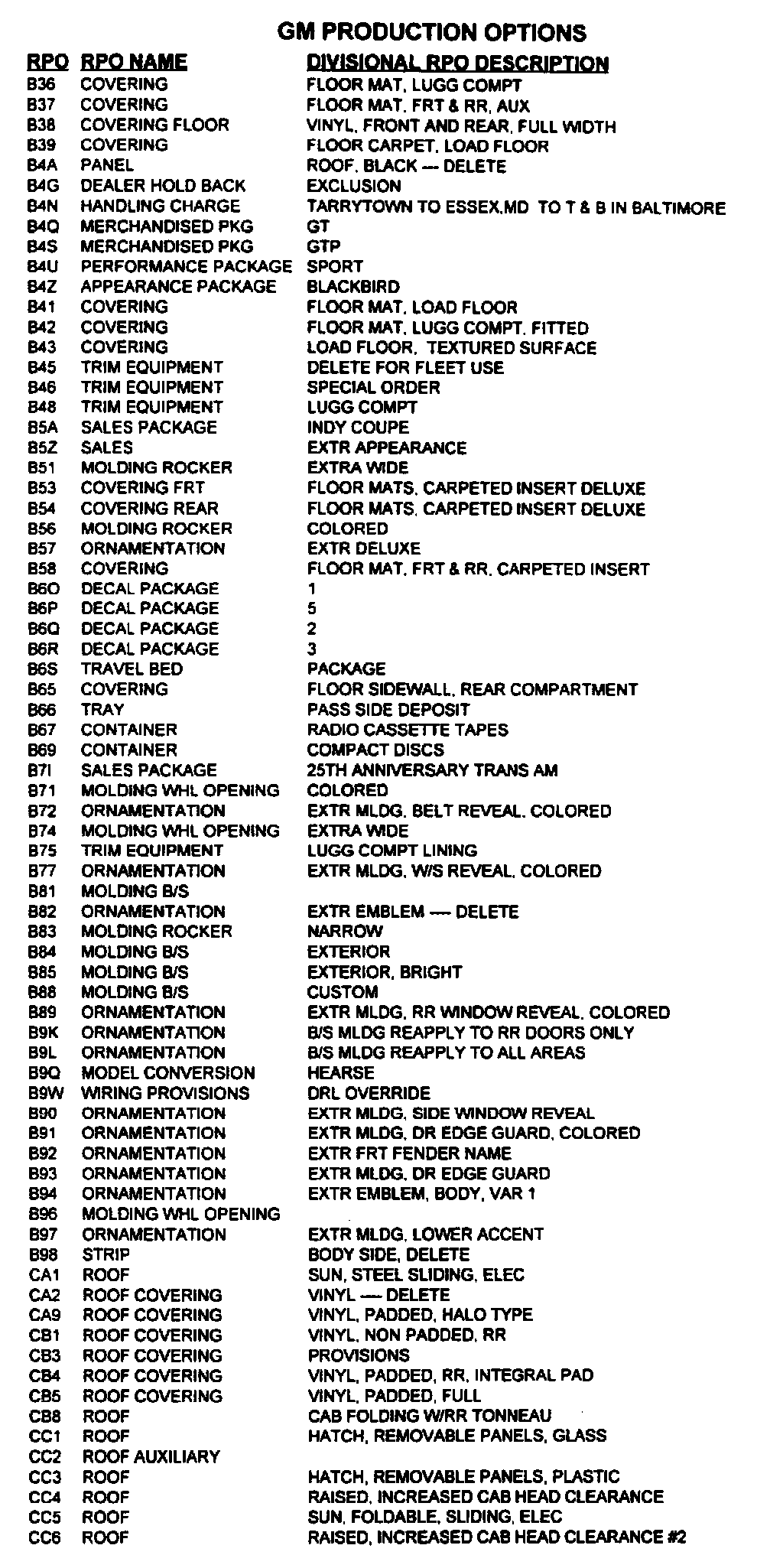 RPO Code List