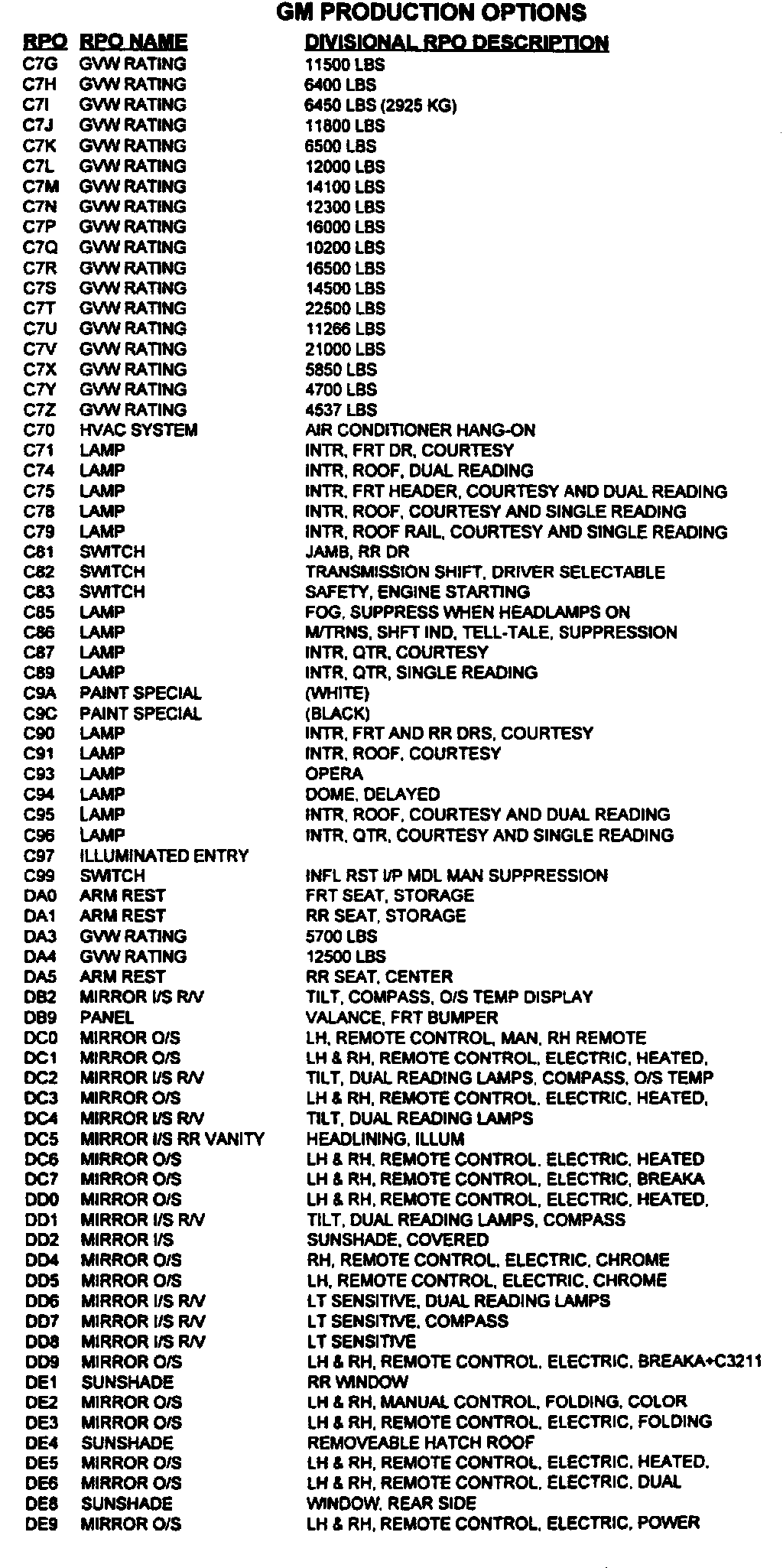 RPO Code List
