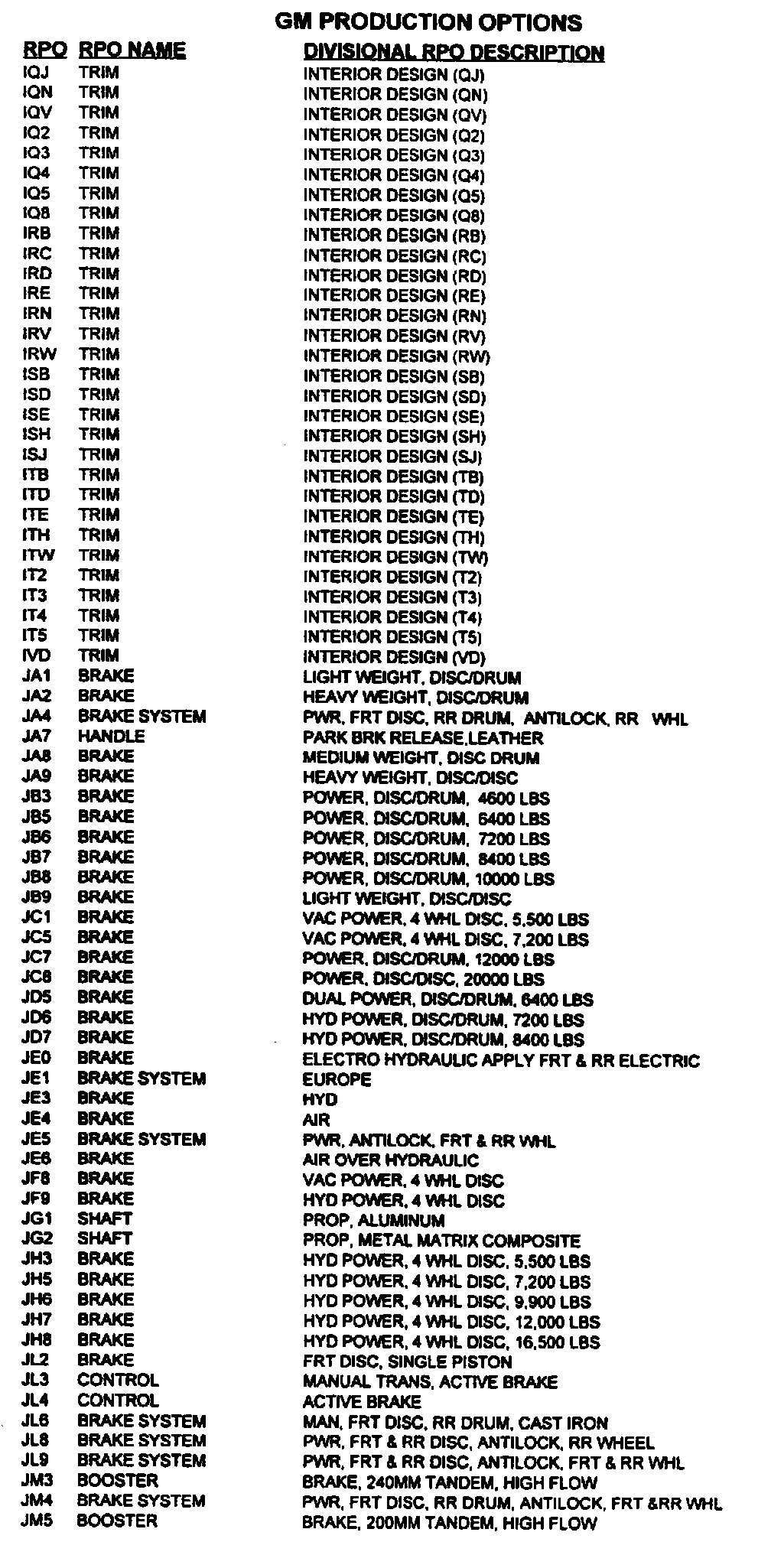 RPO Code List