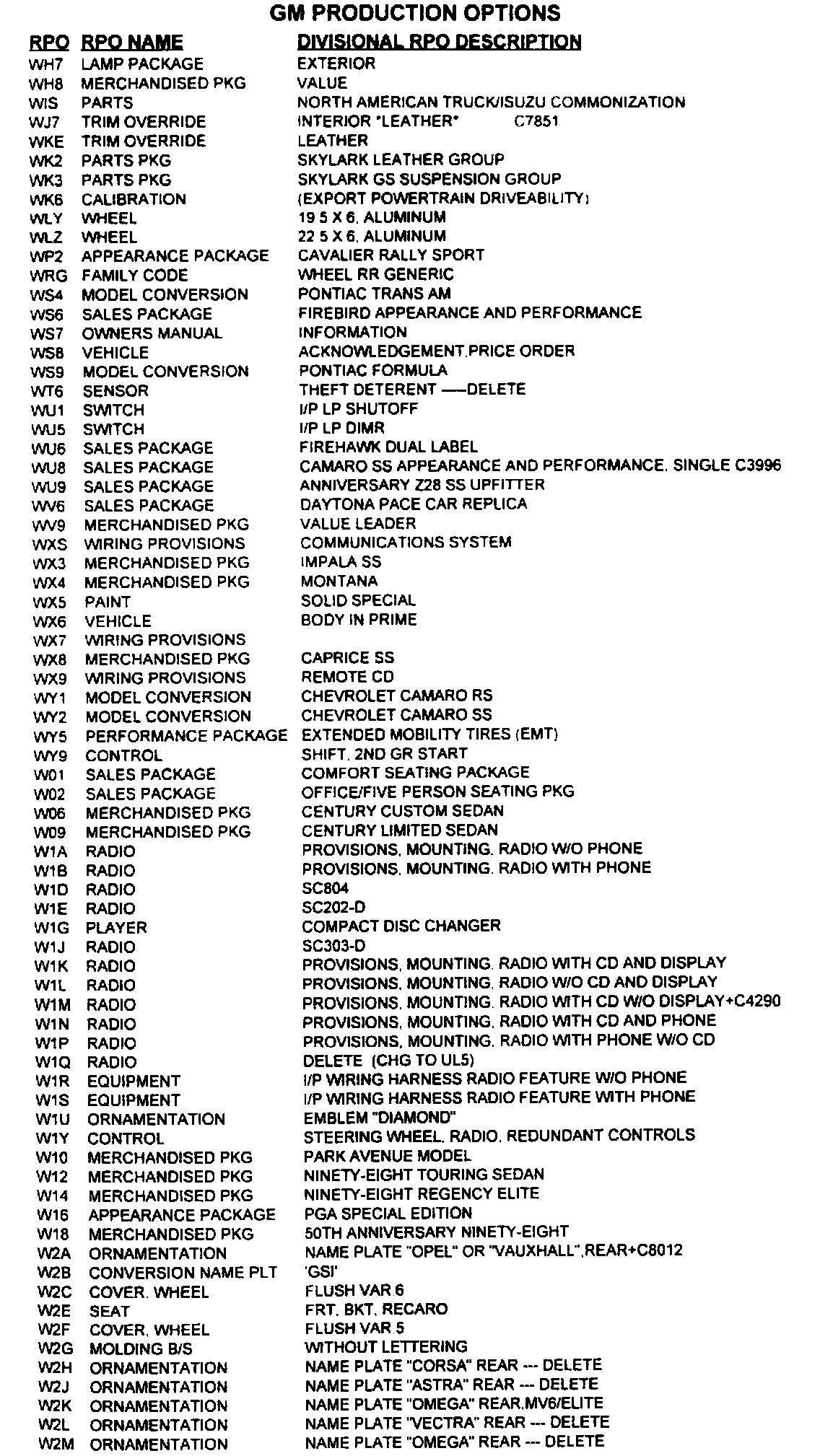 RPO Code List