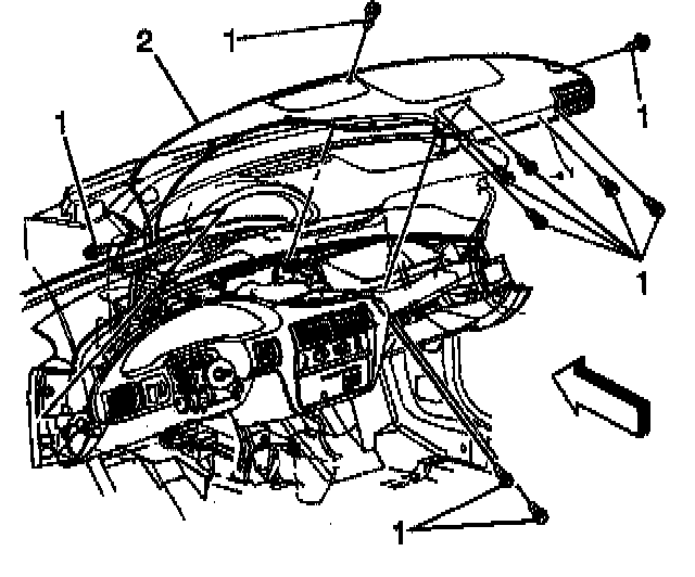 9. Remove all of the hex head screws (1) attaching the instrument panel trim pad (2).