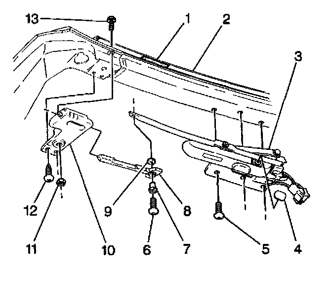 8. Remove the header latch handle assembly retaining screws (1) from the windshield header: