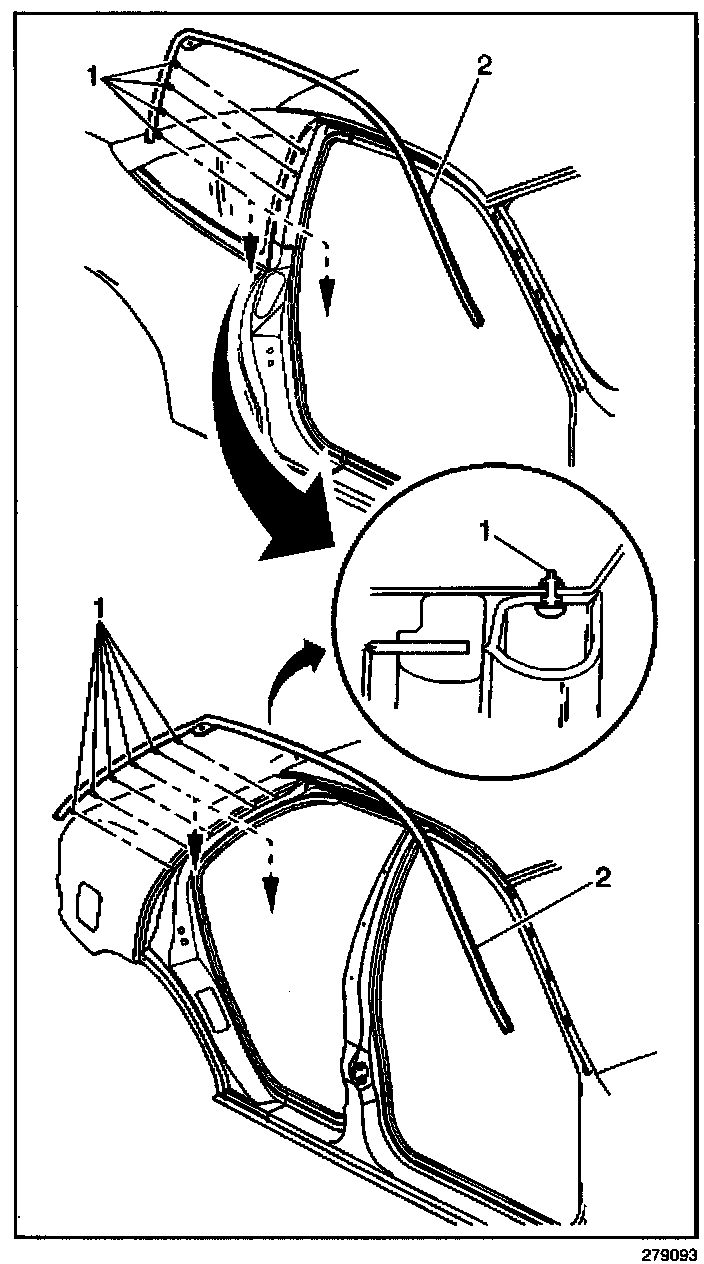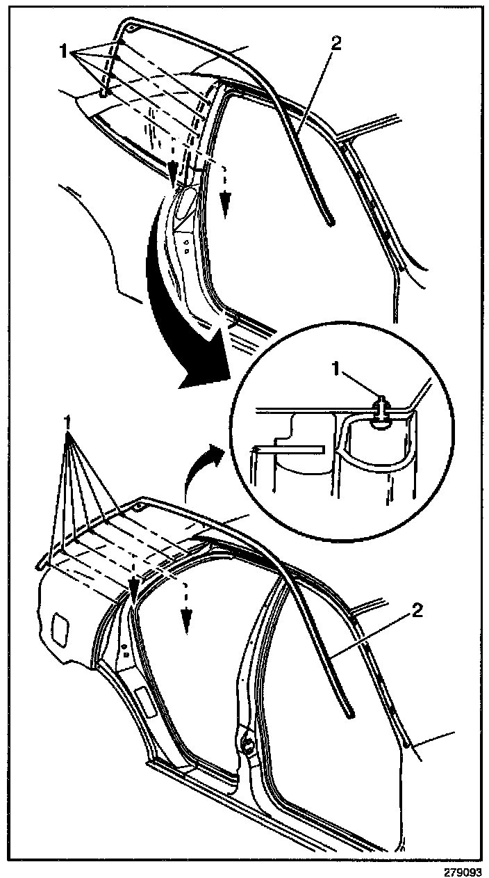 4. Pull the auxiliary weatherstrip (1, 2) free of the vehicle.