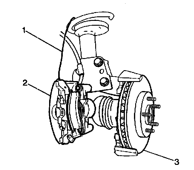 ^ If the caliper assembly is not being removed from the vehicle for unit repair, suspend the caliper with a wire hook from the strut (1).
