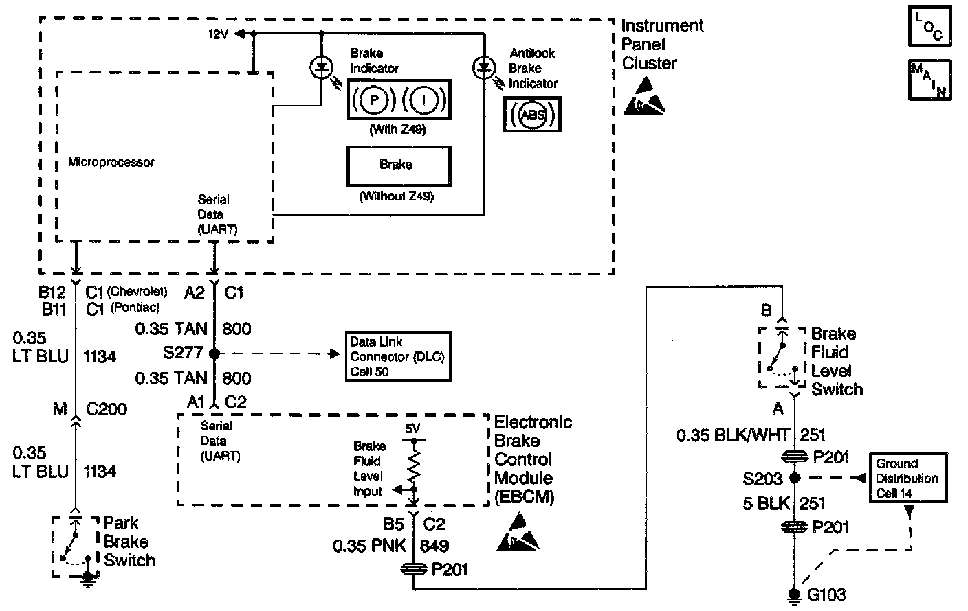 The BRAKE warning indicator lamp has two functions. First, it will light whenever the park brake is set. Second, a switch built into the brake master cylinder reservoir will signal the Electronic Brake Control Module (EBCM) if the brake fluid level drops below a safe level. The EBCM will command the indicator on via serial data with the instrument cluster. In addition, the indicator is commanded on when the EBCM is initially powered up (the ignition switch is turned to the RUN position). With the ignition switch in the OFF/UNLOCK or CRANK positions (loss of EBCM serial data), the indicator will also be illuminated.