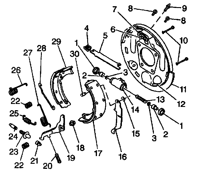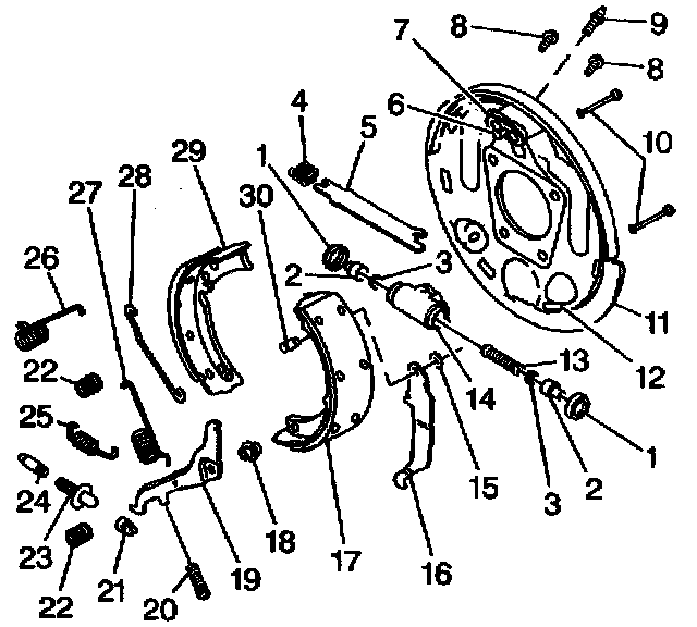 8. Insert a screwdriver between the brake shoe and the lower part of the rear park brake lever (16).