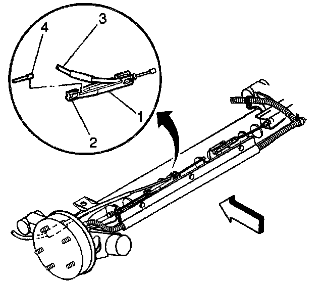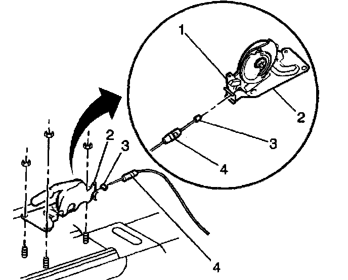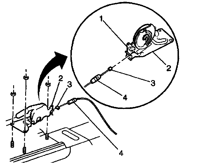 9. Pull the cable (3) until the notch on the ratchet (1) is visible through the cover plate opening (4).