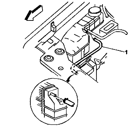 16. Disconnect the surge tank inlet hose and the clamp (1) from the radiator.