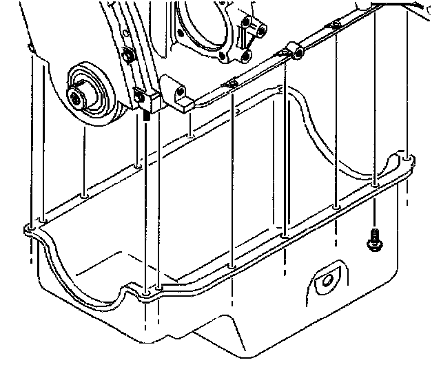 1. Place a 2 mm diameter bead of GM P/N 12346286 Loctite 5900 or equivalent to the oil pan sealing surface, except at the rear seal mounting surface.