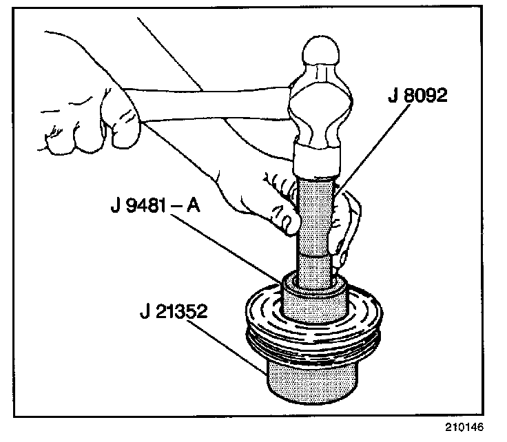 IMPORTANT: Do not allow a metal stake to contact the outer face of the bearing in order to prevent distortion of the outer race.