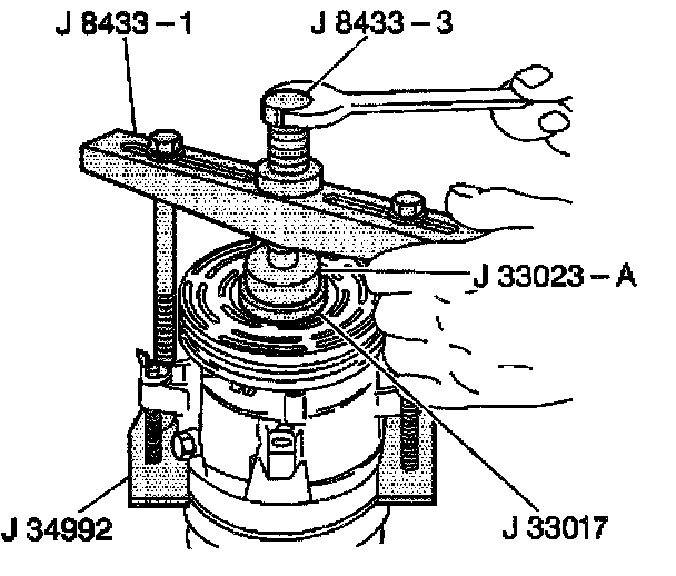 15. Tighten the J 8433-3 in the J 8433-1 in order to force the pulley rotor and bearing assembly onto the front head of the compressor.