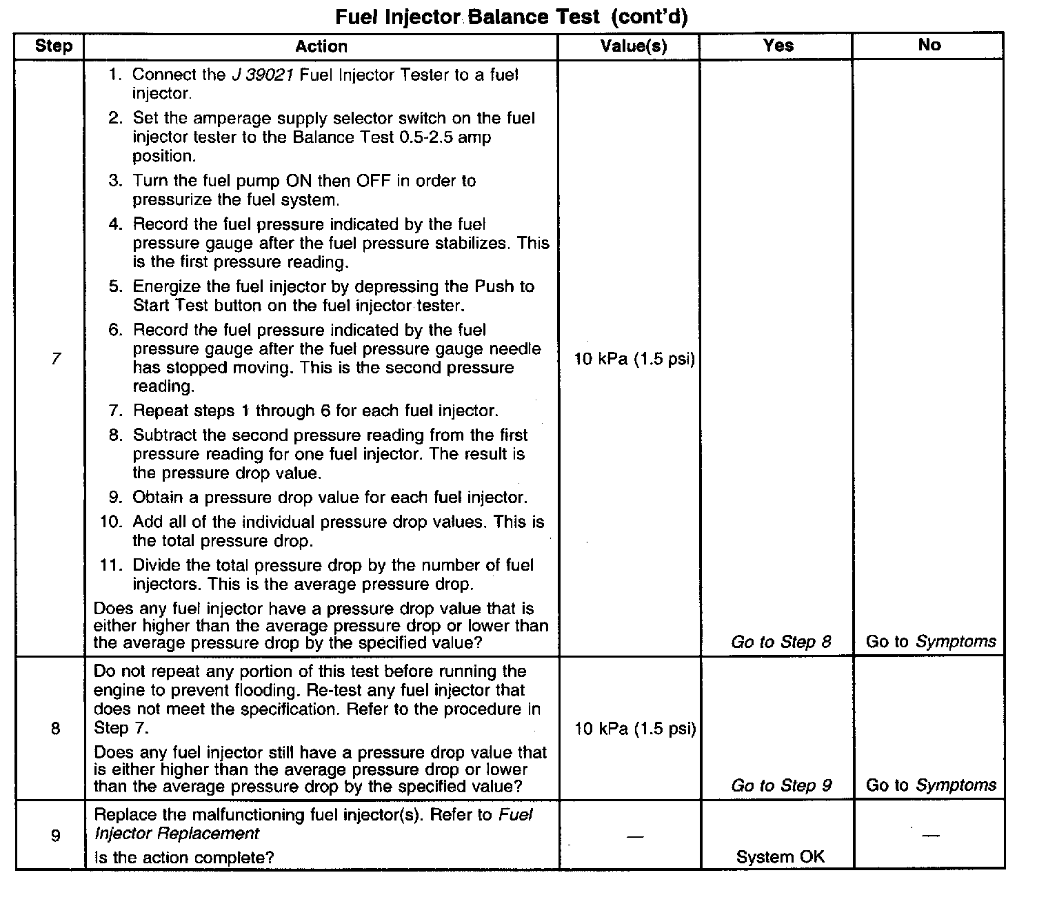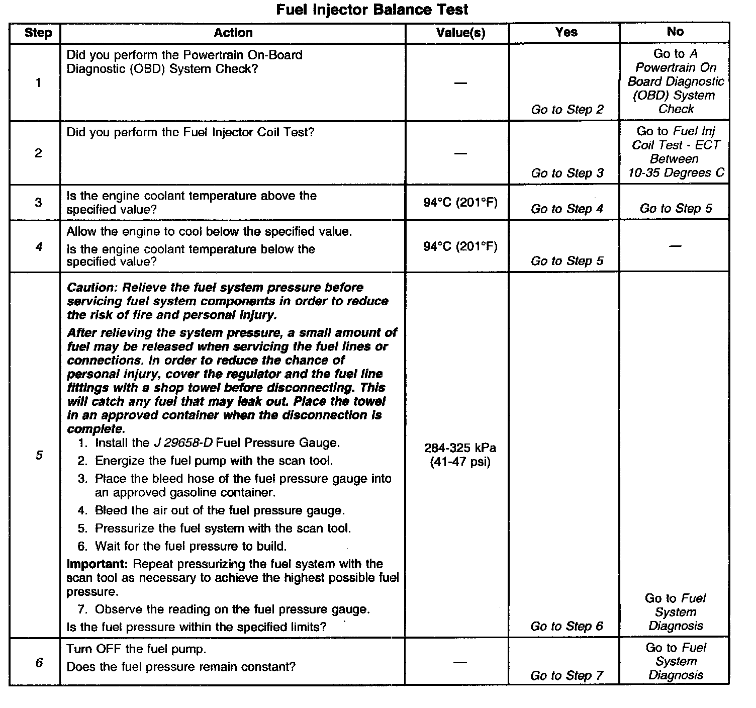 5. The fuel pressure should be within the specified range. If the fuel pressure is not within the specified range, go to Fuel System Diagnosis. Component Tests and General Diagnostics