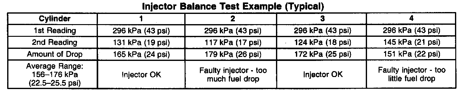 7. If the pressure drop value for each fuel injector is within 10 kPa (1.5 psi) of the average pressure drop value, the fuel injectors are flowing properly. Calculate the pressure drop value for each fuel injector by subtracting the second pressure reading from the first pressure reading. Refer to the illustration.