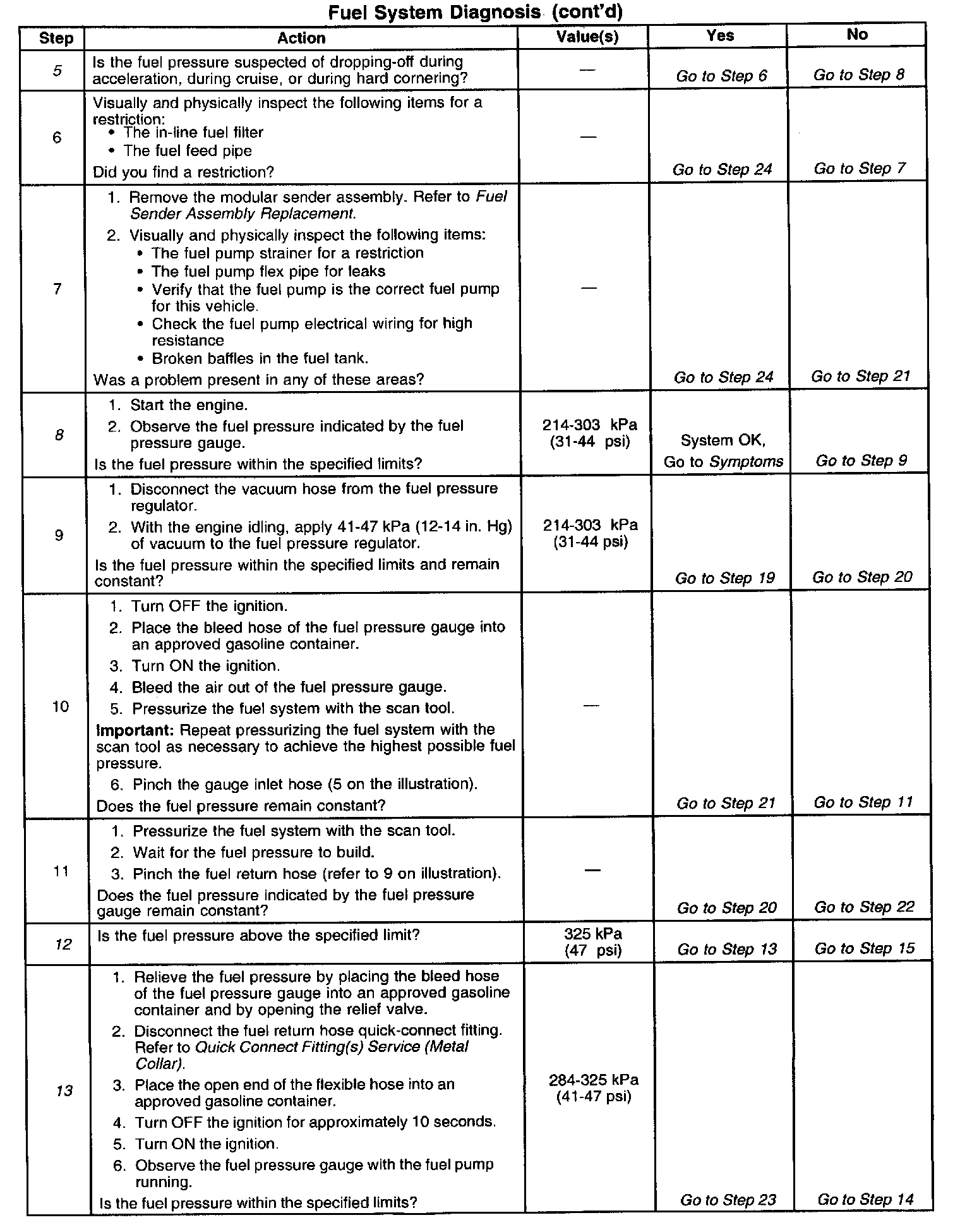 13. This test determines if the high fuel pressure is due to a restricted fuel return pipe or if the high fuel pressure is due to a malfunctioning fuel pressure regulator.