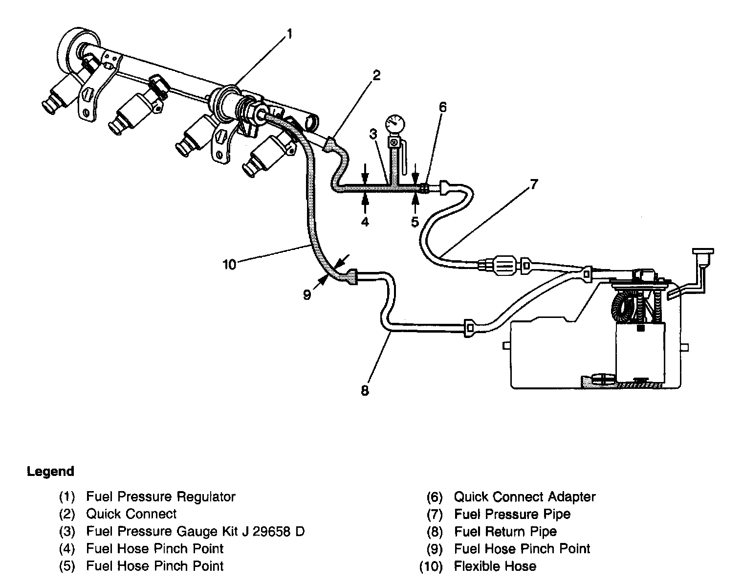 3. A fuel system that drops more than 5 psi in 10 minutes has a leak in one or more of the following areas: