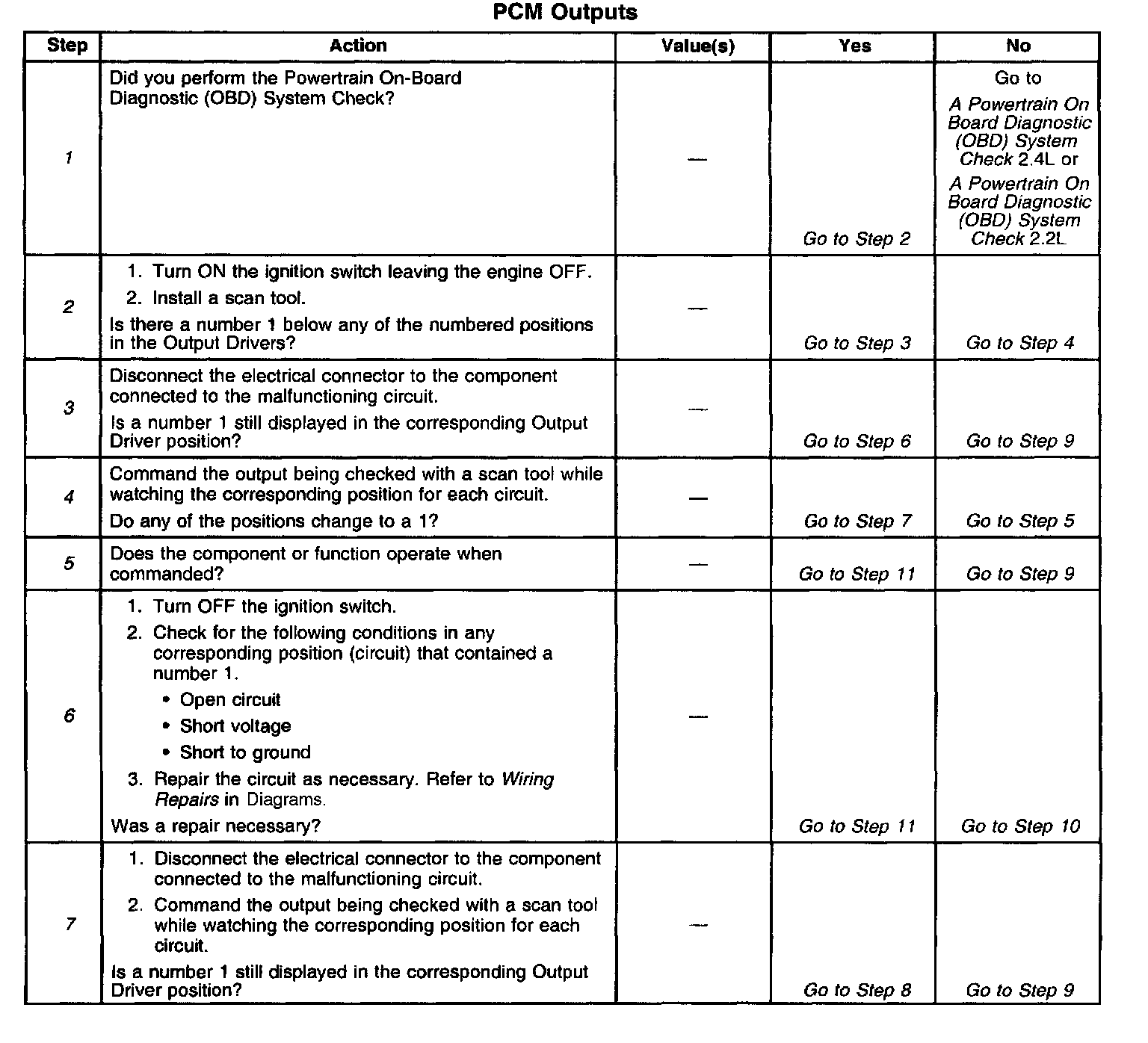 The following table will diagnose the PCM controlled outputs from the output driver modules only. For diagnosis of the cooling fan circuit, refer to Electric Cooling Fan Diagnosis 2.4L or Electric Cooling Fan Diagnosis 2.2L. For diagnosis of the cruise control module circuit, refer to Cruise Control Diagnosis 2.4L or Cruise Control Diagnosis 2.2L. For specific system components and wiring refer to the Electrical Diagnosis or Transmission Diagnosis for transmission related components. Component Tests and General Diagnostics Component Tests and General Diagnostics
