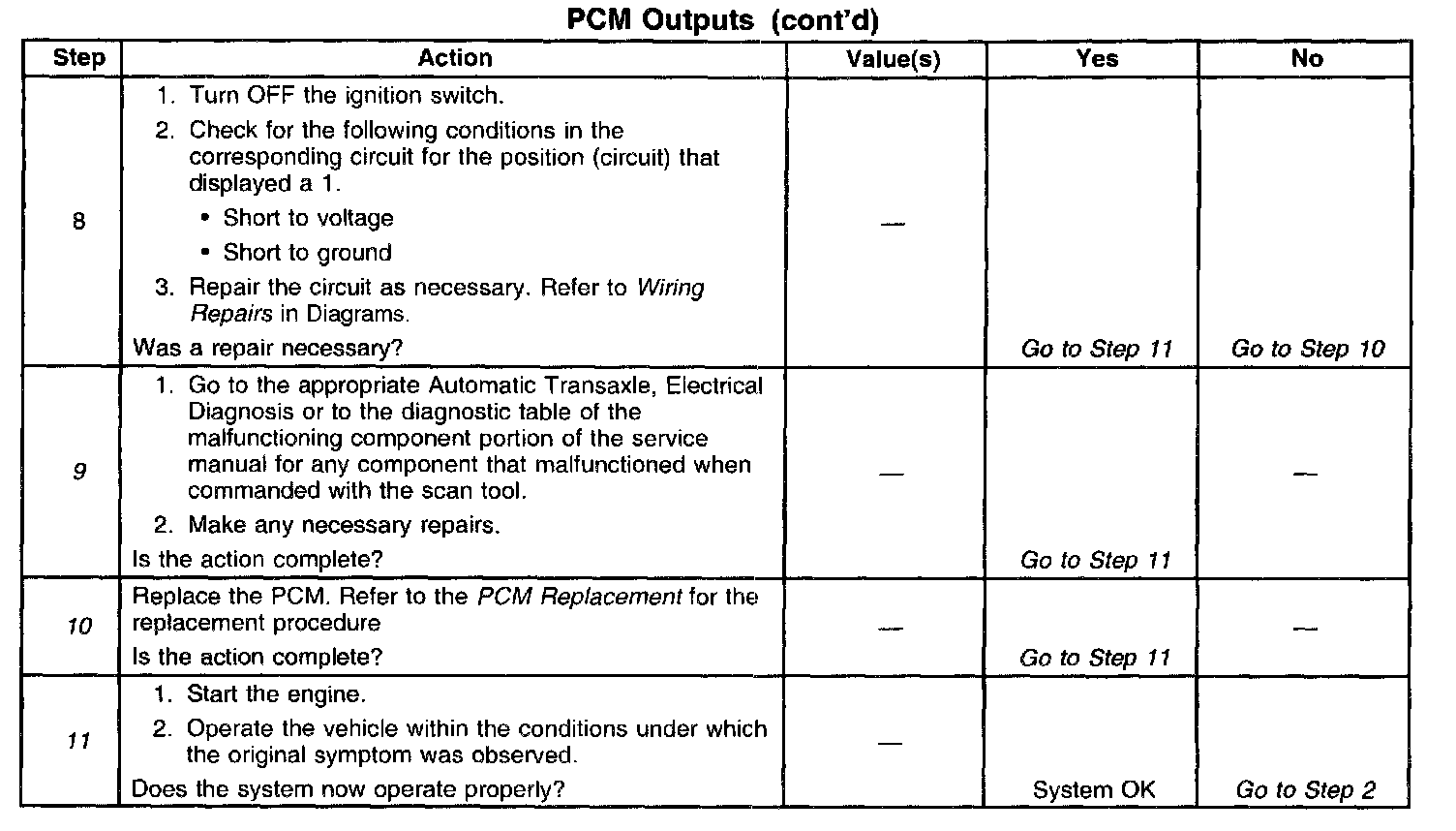 9. A component or function that failed to operate at this point indicates that the malfunction is not on the PCM side of the circuitry. Go to the appropriate Automatic Transaxle, Electrical Diagnosis or to the diagnostic table of the malfunctioning component portion for further diagnosis.