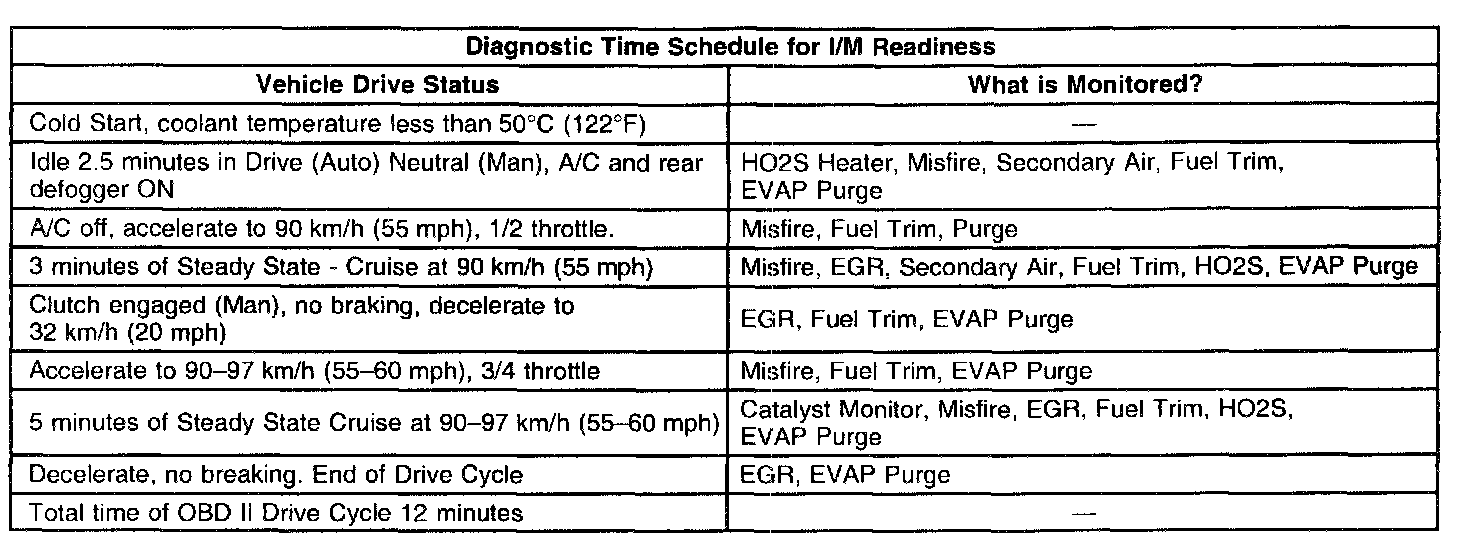 IMPORTANT: The System Status display indicates only whether or not the test has been completed. The System Status display does not necessarily mean that the test has passed. If a Failed Last Test indication is present for a DTC associated with one of the above systems, that test is failed; diagnosis and repair is necessary in order to meet the I/M 240 requirement. Verify that the vehicle passes all of the diagnostic tests associated with the displayed System Status prior to returning the vehicle to the customer. Refer to the Typical OBD II Drive Cycle table (more than one drive cycle may be needed) to use as a guide to complete the I/M 240 System Status tests.