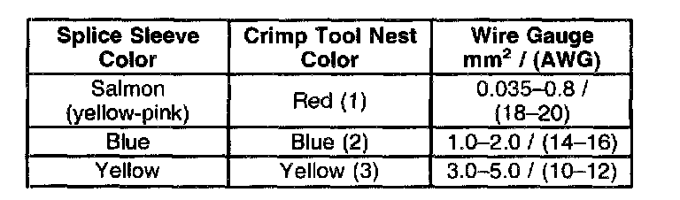 4. Select the proper sealed splice sleeve according to the wire size. Refer to the above table at the beginning of the repair procedure for the color coding of the splice sleeves and the crimp tool nests.