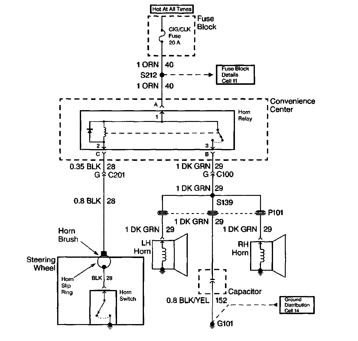 When diagnosing a horn problem use the service information located in the Horns service category. The following schematic is a typical example of a schematic with its supporting text.