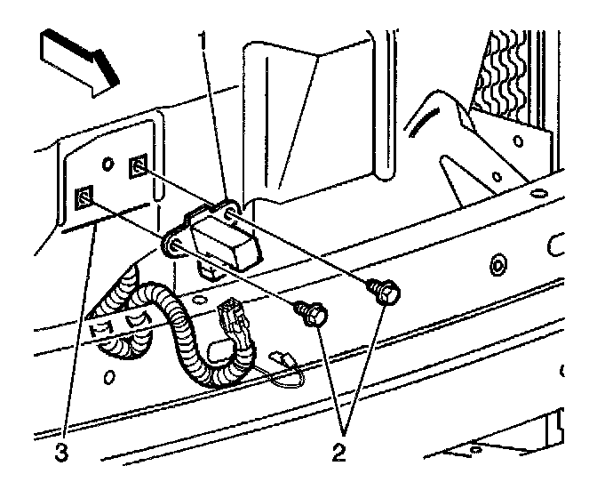 1. Install the Inflatable Restraint Front End Discriminating Sensor (1) to the hood latch support bracket (3).