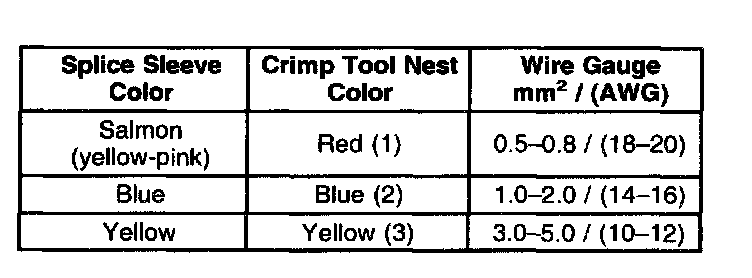 Refer to the table for color coding of the splice sleeves, and the crimp tool nests.