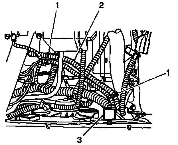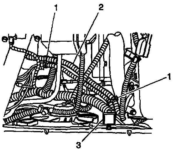 14. Route and attach the service relay harness (3) to the vehicle wiring harness (2) using the two plastic clips (1) already attached to the relay harness.