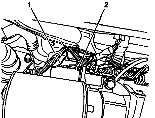 39. If equipped, remove the 10 mm hex head nut from the ground stud on the engine block. If no ground stud is present, remove one of the bolts (2) that attach the starter solenoid (1) to the starter motor.