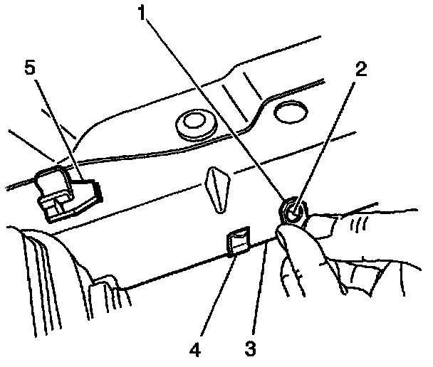6. Slide the J-nut (1) included in the harness kit on the bottom edge of the upper radiator support (3) so that it is located just to the right of the existing clip (4). If there is no clip, use the prop rod holding clip (5) as a reference for determining the correct location for the J-nut.