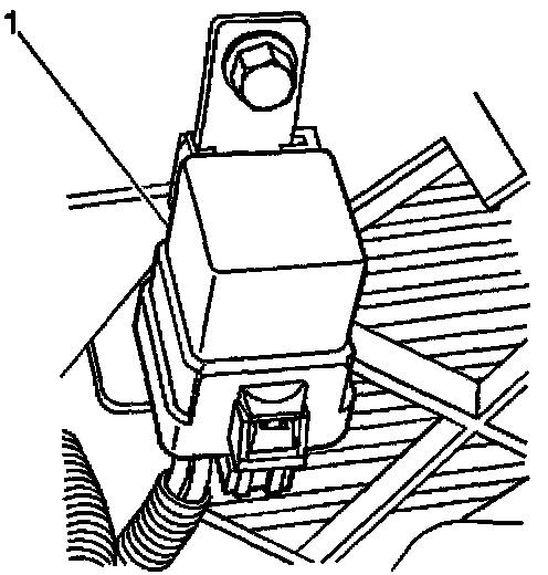 8. Using the 10 mm hex head bolt provided in the harness kit, attach the relay (1) to the radiator support using the previously drilled hole and J-nut.