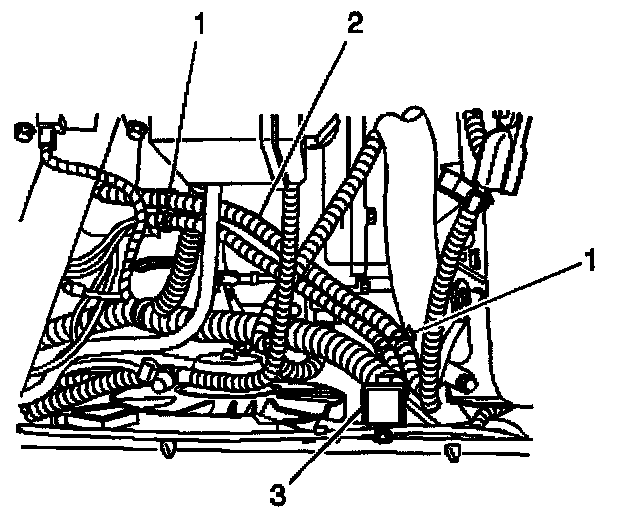 9. Route and attach the service relay harness (3) to the vehicle wiring harness (2) using the two plastic clips (1) already attached to the relay harness.