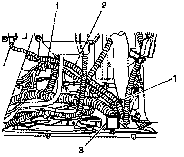 14. Route and attach the service relay harness (3) to the vehicle wiring harness (2) using the two plastic clips (1) already attached to the relay harness.