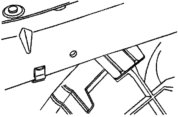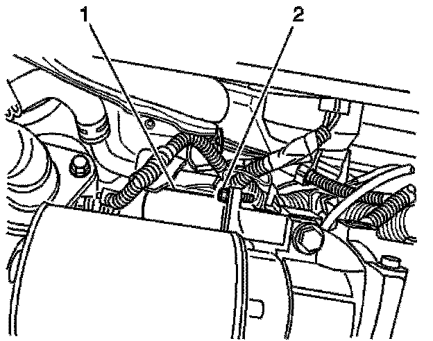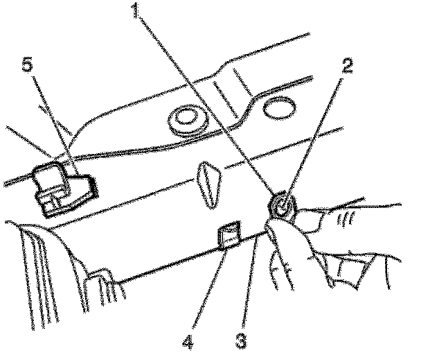 1998-2001 J car - Cavalier/Sunfire with 2.2L Engine (VIN Code 4)1. Slide the J-nut (1), included in the harness kit, on the bottom edge of the upper radiator support (3) so that it is located just to the right of the existing clip (4). If there is no clip, use the prop rod holding clip (5) as a reference for determining the correct location for the J-nut.