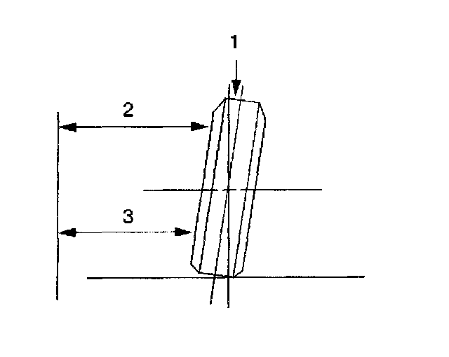 The camber is the tilting of the front wheels from the vertical (1) when viewed from the front of the vehicle. When the wheels tilt outward at the top, the camber is positive (+). When the wheels tilt inward at the top, the camber is negative (-). The amount of tilt is measured in degrees from the vertical. The camber setting influences the directional control and the tire wear.