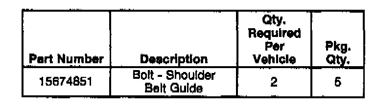 Replace the shoulder belt to the pillar attaching bolt with new bolt P/N 15674851, using the following service procedure. Inspect the plastic cover for cracks or damage and replace the cover if necessary. Also replace the shoulder belt bolt and inspect the cover on the opposite side of the vehicle.
