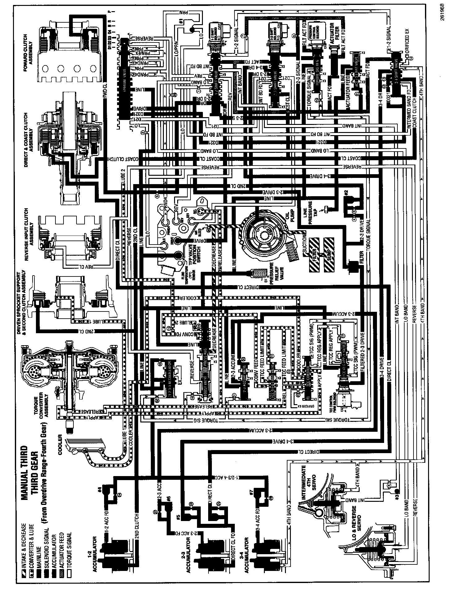 D321 fluid pressure assists a spring force in order to keep the valve in the Third gear position under any conditions. this opens the Forth band fluid circuit to an orificed exhaust and the Intermediate and Fourth band releases, thereby preventing Fourth gear.