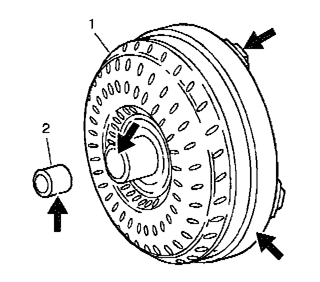 1. Position the torque converter (1) on the bench with the flywheel lugs facing down.