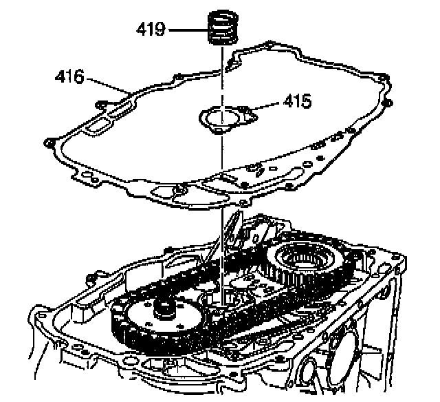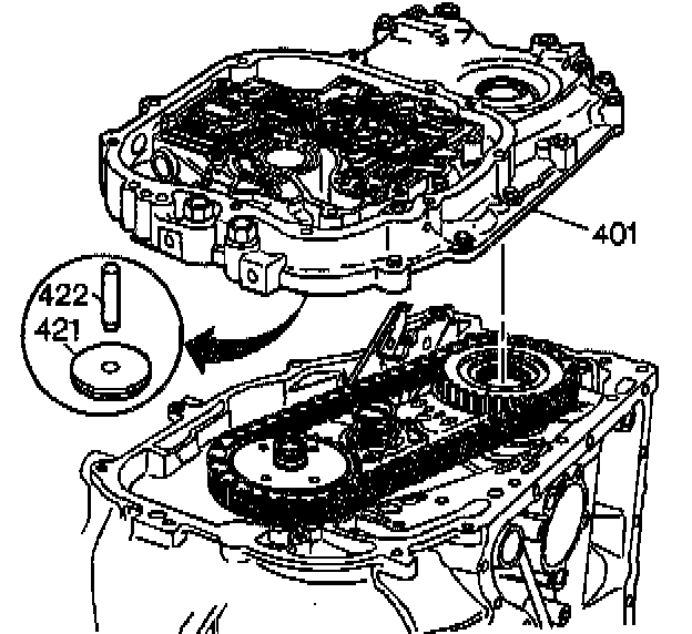 IMPORTANT: The 1-2 accumulator piston (421) and the pin (422) may have remained within the case cover (401).