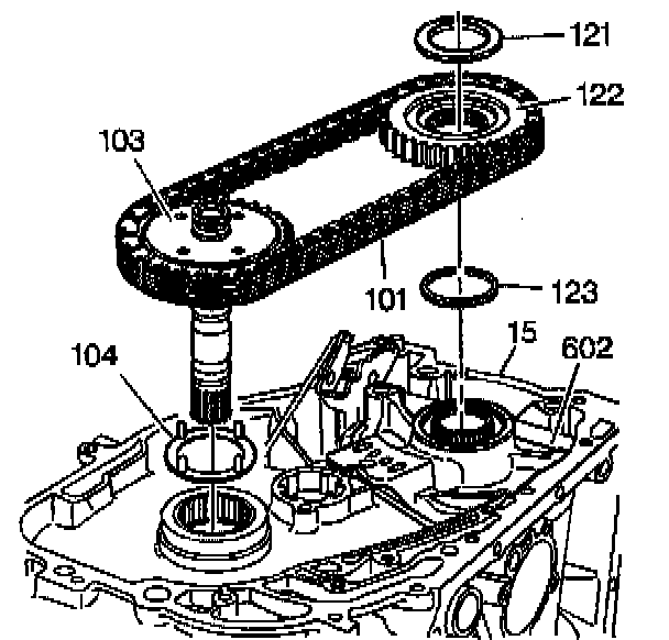 4. Remove the driven sprocket support thrust washer (123) from the driven sprocket support (602).