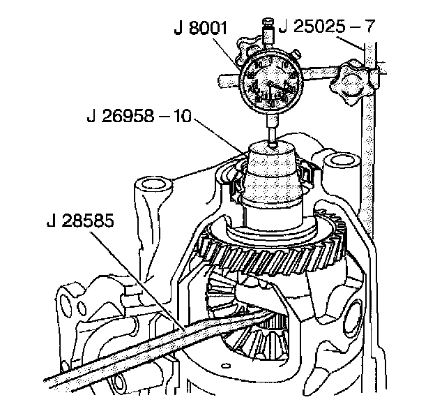3. Install J 25025-7A and J 8001 with the indicator stem touching J 26958-10.