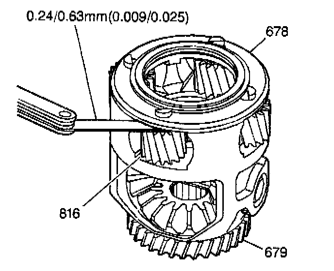 2. Using a feeler gage, measure the end play of the planetary pinion gear (816) for the differential carrier. The end play should be 0.24-0.63 mm (0.009-0.025 inch).