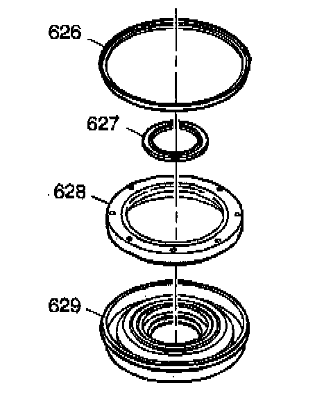 13. Affix the inner and the outer seals (627, 626) onto the forward clutch piston (629).