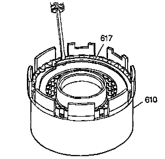 1. Use a flat blade screwdriver in order to remove the direct clutch retaining ring (617) from the direct clutch housing (610).