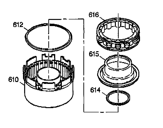7. Remove the inner and outer seals (614, 612) from the direct clutch piston (615).