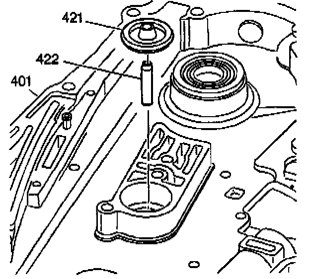 3. Slide the 1-2 accumulator piston pin (422) into the case cover (401) with the chamfered end away from the case cover (401).